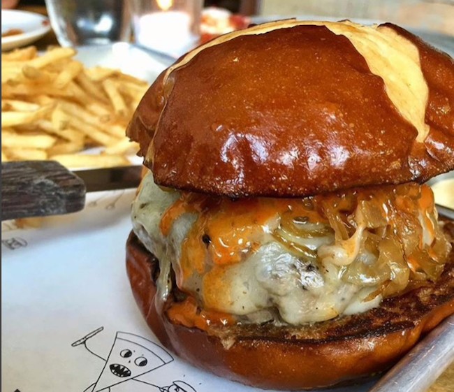 La hamburguesa de este restaurante tiene salsa de búfala y queso. A pesar de ser un restaurante especializado en pizzas, la hamburguesa también es uno de sus productos estrella.