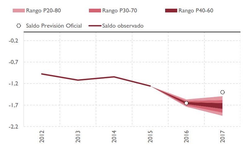 Escrivá ha apuntado a que las previsiones del Gobierno en lo que tiene que ver con el gasto de la Seguridad Social han sido bastante precisas en los últimos años. No se puede decir lo mismo en lo que tiene que ver con los ingresos. Aquí, los Presupuestos del organismo público han fallado de forma recurrente y siempre en la misma dirección: se han quedado cortos, muy lejos de los ingresos que preveía el Gobierno. La AIReF cree que, en este año 2017 que recién comienza, también incumpliremos. La cifra oficial habla de un déficit del 1,4% del PIB para la Seguridad Social. Como puede verse en el siguiente gráfico y como ha apuntado el presidente de la AIReF, "en ningún escenario" de los previstos para 2017 se alcanza ese 1,4%, ni siquiera en los más optimistas.