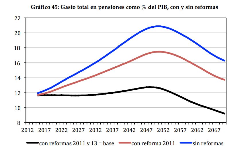 Las reformas de las pensiones aprobadas en 2011 y 2013 "ponen al sistema de pensiones en modo automático, para que la cosa no explote. Las pensiones existentes se van ajustando a la baja en términos reales si el sistema entra en déficit".