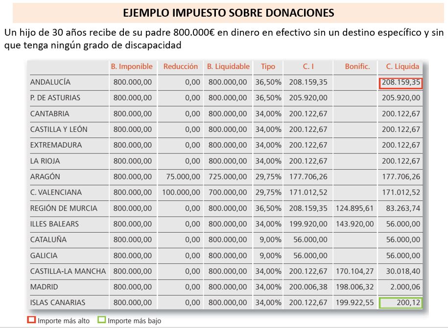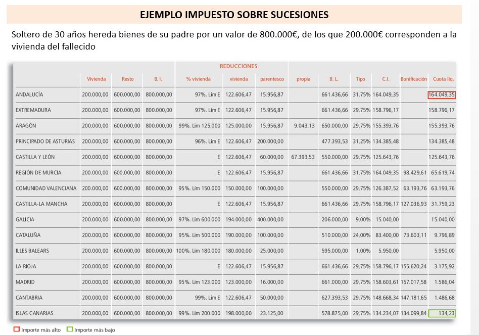 En Sucesiones, las comunidades han regulado las tarifas. Pero las grandes diferencias llegan por las bonificaciones (en varias regiones prácticamente se libera del pago de este impuesto a los descendientes y ascendientes directos) o en la reducción de la base hasta una determinada cantidad. Esto genera enormes diferencias en lo que se paga en concepto de herencia según las comunidades. Por ejemplo, como vemos en el cuadro resumen de REAF, en una simulación para un soltero de 30 años, que hereda bienes por valor de 800.000 euros de los que 200.000 corresponden a una vivienda. Mientras en Madrid, Cantabria o Canarias apenas tendría que pagar nada (cantidades simbólicas, por debajo de 2.000 euros), en Andalucía la factura sería de más de 164.000 euros.