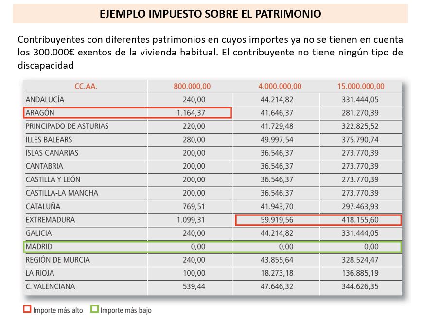 Las diferencias en Patrimonio tienen que ver tanto con los mínimos exentos como con los tipos. Como ya hemos dicho, Madrid tiene una bonificación del 100% (en La Rioja es del 50% y en el País Vasco y Navarra también tiene una regulación especial). En el resto de las comunidades, el punto de partida es la normativa nacional, que fija una exención por vivienda habitual de 300.000 euros y un mínimo exento de 700.000 euros. Luego, las regiones pueden modificarlo al alza o a la baja: en Aragón (400.000 euros de mínimo exento), Cataluña (500.000 euros), Extremadura (500.000 euros) y Valencia (600.000) se ha bajado ese mínimo exento.
