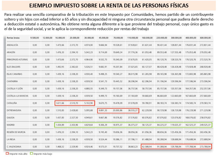 Madrid tiene los impuestos más bajos; Valencia, Cataluña, Andalucía y Extremadura, los más altos. La XVI edición del informe Panorama de la Fiscalidad Autonómica y Foral no contiene demasiadas novedades respecto a anteriores ejercicios. Este lunes lo ha presentado en Madrid REAF-Regaf Asesores Fiscales, el órgano especializado en estos menesteres del Consejo General de Economistas, que cada año actualiza dicho estudio.