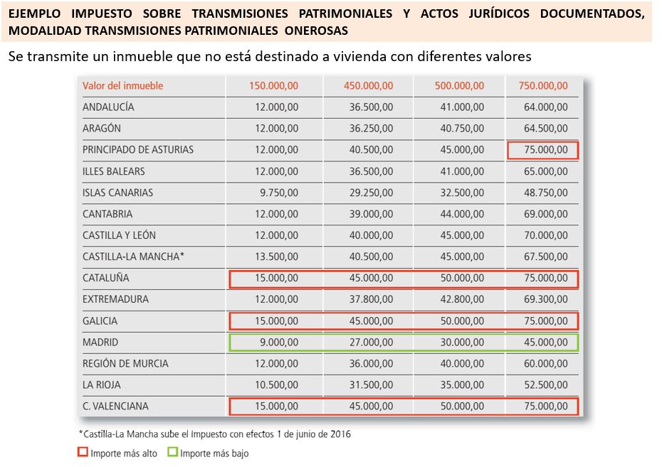 También aquí las CCAA han ejercido sus competencias. Madrid vuelve a ser la que aplica tipos más bajos y condiciones más ventajosas, tanto en ITP como en AJD. Por ejemplo, en el siguiente caso propuesto por REAF, que implica la transmisión de un inmueble no destinado a vivienda habitual: para un valor de 750.000 euros, en Madrid la factura tributaria se quedaría en 45.000 euros, mientras que en Asturias, Cataluña, Galicia y Valencia se dispararía hasta los 75.000 euros.