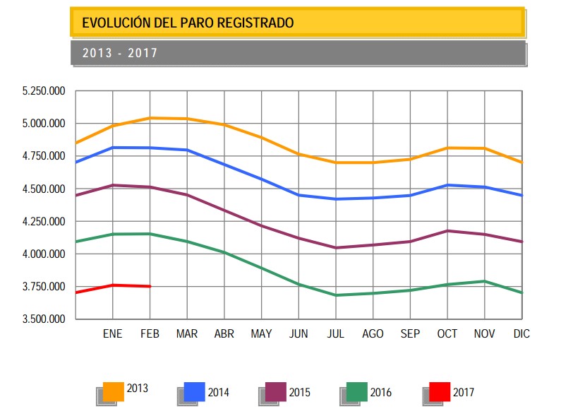 Dentro de la serie histórica comparable, que arranca en 1996, la evolución del paro en los meses de febrero ha sido desigual, con descensos en doce meses y aumentos en nueve de ellos, la mayoría concentrados en el periodo 2008-2013. El descenso de febrero de 2017 es el segundo más pronunciado de los últimos doce años, sólo superado por el de 2015, cuando el desempleo bajó en 13.538 personas. En febrero de 2016 el paro subió en 2.231 personas y en los últimos ocho años ha aumentado en una media de 57.863 desempleados.
