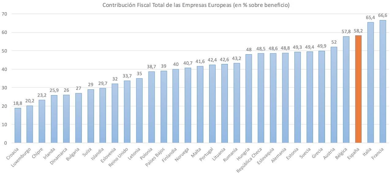 Tomando como referencia datos del Banco Mundial, el IREF calcula la contribución fiscal total de las pymes europeas. El resultado es desolador para España, ya que, en nuestro caso, el 58% del beneficio antes de impuestos va a parar al pago de Impuesto de Sociedades, IVA y cotizaciones sociales.