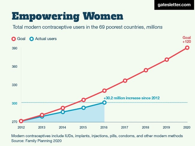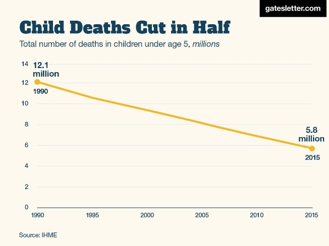 A día de hoy, el número de muertes de niños menores de cinco años se ha reducido a la mitad, de 12,1 millones en 1990 a 5,8 millones en 2015. Inversiones tan simples como mosquiteras y pozos de agua potable han sido los instrumentos clave para reducir este número tan drásticamente. El matrimonio Gates ha invertido mucho dinero en mejorar las condiciones de los niños de países en desarrollo, sobre todo durante su viaje a África en 1990.