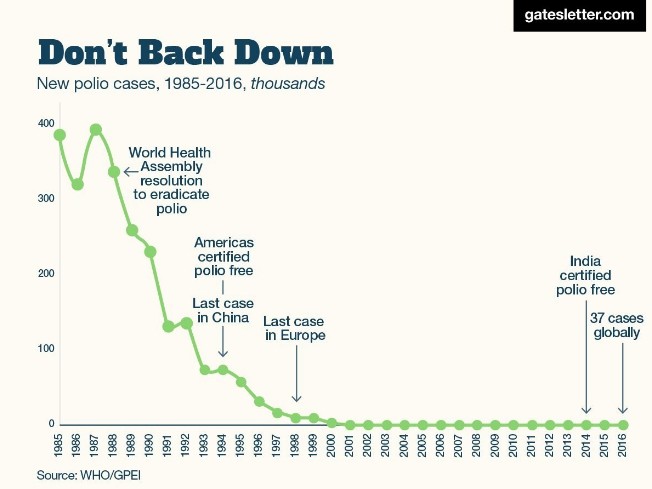 Durante los últimos 17 años, los casos de polio no han bajado mucho porque están muy próximos a cero. 64 años después del desarrollo de la primera vacuna, los países siguen haciendo esfuerzos para que esta enfermedad no se propague. El último país en desarrollar casos fue China (1990) e India (2000). En 2016, hubo 40 casos registrados y actualmente, solo cuatro países presentan casos.