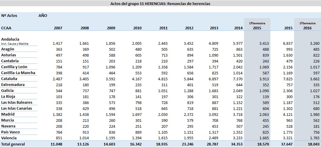 Si a ello, además, se suma el impacto de la crisis, con las consiguientes dificultades para hacer frente a las posibles deudas que puedan incluir tales herencias, el resultado es que el número de renuncias se ha disparado en los últimos años. En concreto, su número se ha multiplicado por más de tres desde que estalló la crisis financiera internacional, al pasar de poco más de 11.000 casos en 2007 a casi 38.000 en 2015, según los datos recopilados por el Consejo General del Notariado. Asimismo, aunque se ha registrado una ligera caída interanual en el primer semestre de 2016 -ultimo dato disponible-, todo apunta a que el pasado año cerrará con cerca de 36.000 renuncias.
