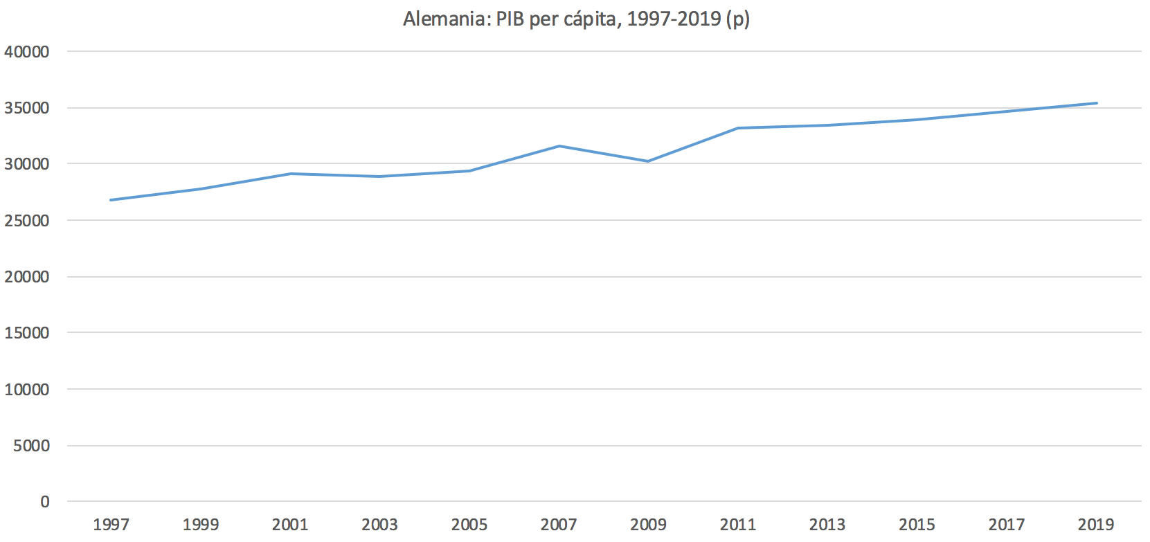 Esa creación de empleo ha reducido el stock de parados y ha facilitado un modelo de crecimiento moderado pero sostenido. En suma, el PIB alemán se comportó muy bien durante el pasado ejercicio y apuntó a un alza del 1,9%. Ampliando la perspectiva, podemos ver que, salvo en los años de la Gran Recesión, el PIB per cápita viene aumentando de manera regular.