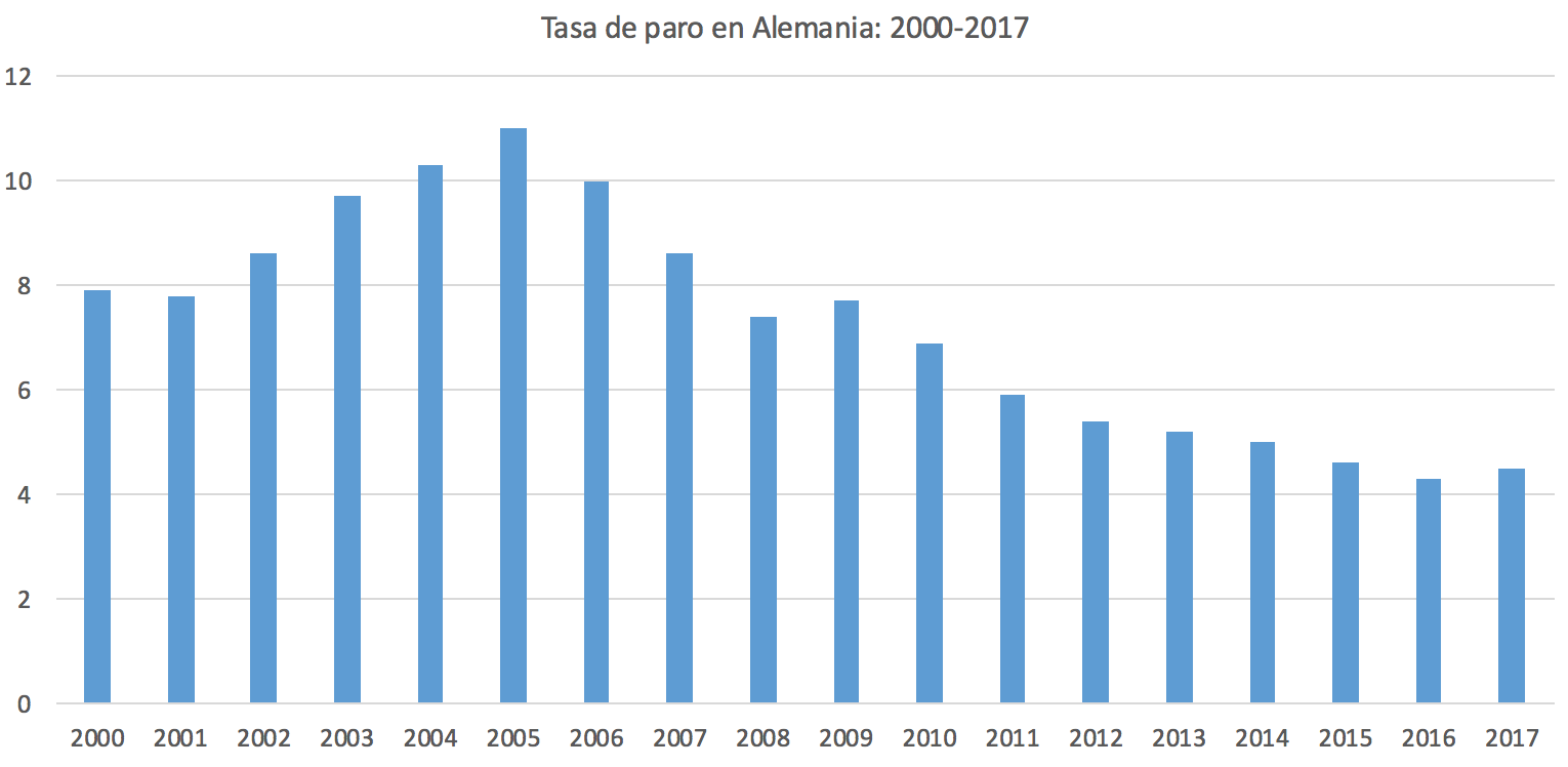Como vemos en la siguiente gráfica, el gigante teutón ha logrado dejar los niveles de paro por debajo del 5%, menos de la mitad de los niveles que se llegaron a dar hace ahora poco más de una década.