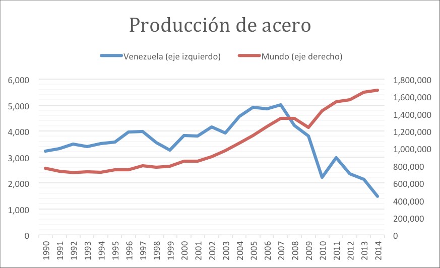 Las industrias nacionalizadas han sido un desastre de tal magnitud que, una vez que el petróleo ha caído de precio, la capacidad de la industria venezolana de rehacerse y aumentar la producción en otras áreas es totalmente nula. Ejemplo paradigmático es la producción de acero en Venezuela. Desde que se nacionalizara en 2008, la producción de acero cae más de un 70%.