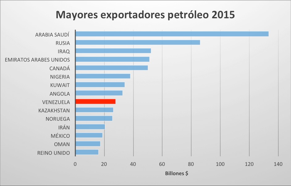 Nos proponemos analizar cómo ha impactado la caída del petróleo en los mayores exportadores de esta materia, entre ellos Venezuela. Desde el punto de vista de la importancia exportadora, parece que existen muchos países con unas exportaciones netas de petróleo muy superiores a la venezolana. De hecho, Venezuela ocupa el 9º lugar del mundo. Las exportaciones rusas casi triplican las exportaciones venezolanas y las saudíes la quintuplican.