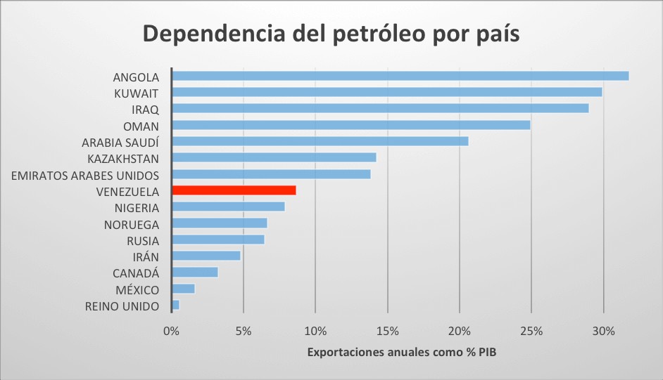 Sin embargo, lo importante para analizar el impacto económico de la caída del precio del crudo en los países exportadores del mismo no son las exportaciones absolutas, sino medidas en términos relativos al tamaño de la economía. Si atendemos a la importancia relativa de las exportaciones de petróleo como % del PIB, vemos cómo Venezuela tampoco aparece entre los primeros lugares.