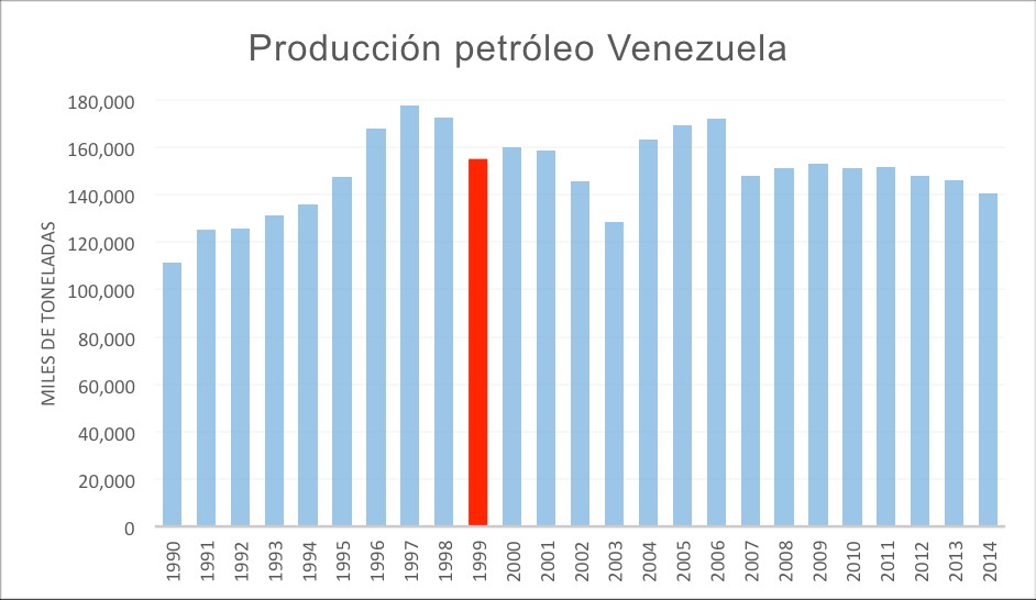 Los desequilibrios económicos acumulados durante años se escondían bajo la lluvia de dólares caída al albur de una renta petrolera sólo creciente en valor y nunca en volumen. La falta de inversión y la baja productividad por trabajador son la tónica habitual en PDVSA. La capacidad de aumentar la producción para contrarrestar la caída en el precio es nula.