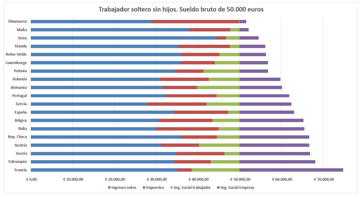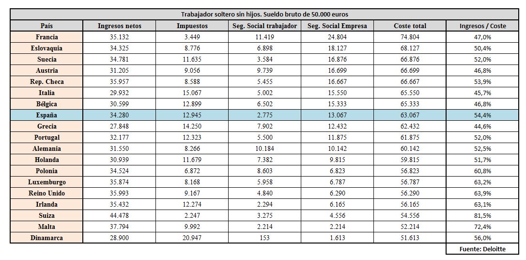 Como puede verse, España está más o menos en mitad de la clasificación tanto en cuanto al coste como a los ingresos netos. Un salario bruto de 50.000 euros genera a la empresa un coste total de 63.067 euros. Al mismo tiempo, el trabajador recibe 34.280 euros. Es decir, este empleado cobra un 54% de lo que su empresa paga por él.