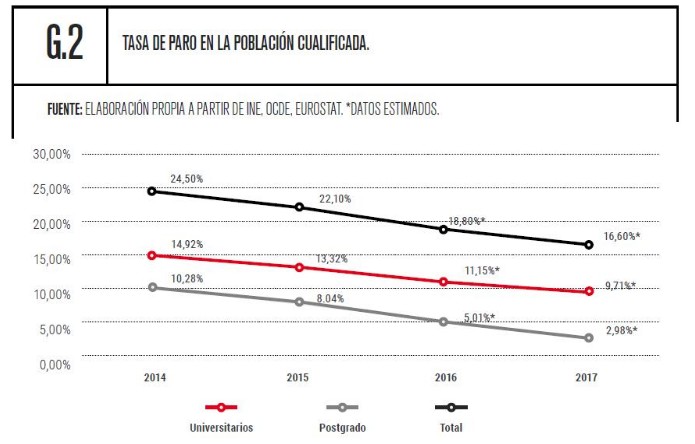 El desempleo entre las personas con título de posgrado ha caído a tasas inferiores al 6% en 2016 y la tasa de desempleo de la población universitaria se ha situado en el 11,15% en el caso de los universitarios y en el 5% en el caso de los posgraduados. En esta línea, EAE Business School prevé que el descenso continúe durante este año y que se sitúe en el 9,71% en el caso de los universitarios y en el 2,98% en el caso de los posgraduados.