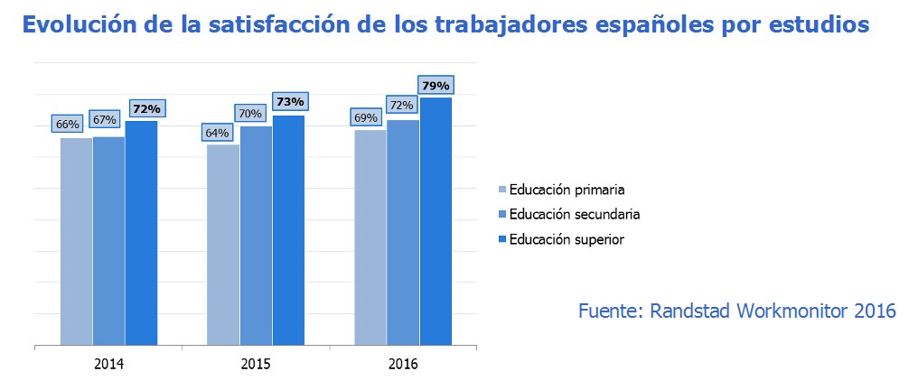 Por otro lado, el 79% de los trabajadores con estudios superiores está satisfecho con su empleo, porcentaje que baja hasta el 73% entre quienes tienen formación secundaria y al 72% entre los que tienen estudios primarios, según un informe de Ransdtad, que constata que a mayor formación, mayor es el nivel de satisfacción laboral.