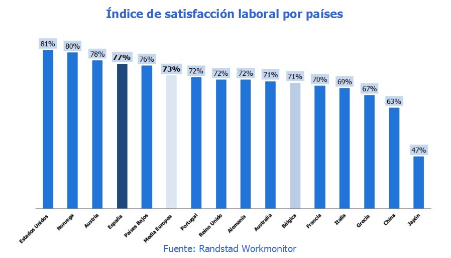En relación a otros países, el grado de satisfacción laboral de los españoles (77%) se sitúa cuatro puntos por encima de la media europea (73%) y supera al de Reino Unido y Alemania (72%), Bélgica (71%) o Francia (70%). Los únicos países europeos que superan a España en satisfacción laboral son Noruega (80%) y Austria (78%). Fuera del entorno europeo, Estados Unidos es el país que registra la mayor tasa de satisfacción (81%), seguido de Australia (71%). A la cola en satisfacción se encuentran China y Japón, con un 63% y un 47%, respectivamente.