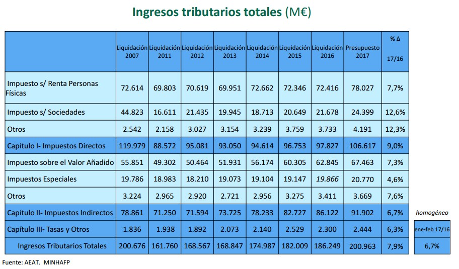 En este sentido, es más significativa la cifra de los ingresos. Montoro ha anunciado que para rebajar el déficit y poder cumplir (por primera vez desde que es ministro de Hacienda) con la cifra original pactada con Bruselas, habrá que subir lo que el Estado recauda vía impuestos. Y no se hará con nuevas medidas tributarias, ha asegurado, sino con el efecto del incremento en la recaudación de la mayor actividad económica. Es un reto complicado, porque recordemos que el déficit tiene que pasar del 4,54% de 2016 (4,33% sin contar ayudas a la banca) al 3,1% para este año. En Hacienda creen que lo conseguirán y estiman que los ingresos tributarios subirán un 8%, hasta superar los 200.000 millones de euros por primera vez desde el año 2007. Sólo este incremento histórico en la recaudación permitirá cuadrar las cuentas.