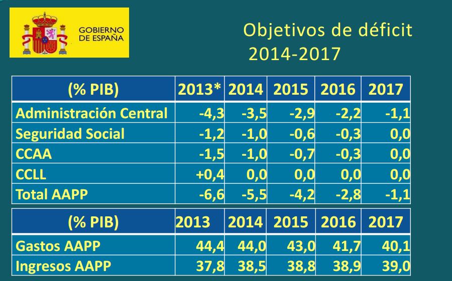 - 2014: hay que recordar que en 2012 la primera cifra de déficit que el Gobierno ofreció para 2014 fue el 2,2% del PIB. Luego, según se fueron incumpliendo los datos de 2012 y 2013, ese nivel fue subiendo, hacia un límite más acorde con el grado de cumplimiento presupuestario de que hacía gala el Gobierno.