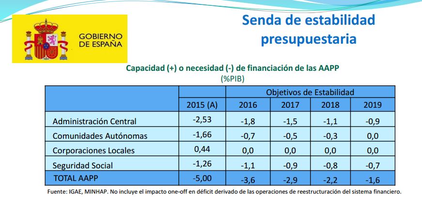 - 2016: el pasado año, el Gobierno lo comenzó con un objetivo de déficit del 2,8%. No sólo ésa era la cifra incluida en los PGE-2016, sino que en marzo, cuando Montoro presentó el cierre del ejercicio presupuestario de 2015, mantuvo esa cifra del 2,8%. Sólo a partir de abril, en el Programa de Estabilidad 2016-2019 (ver siguiente cuadro) el Gobierno cambió esa cifra y empezó a hablar del 3,6%.