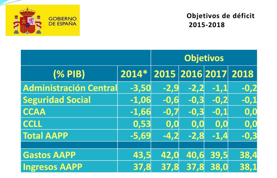 En abril de 2015, todavía se mantenía ese objetivo, como puede verse en la siguiente tabla. Pues bien, incluso aunque fue un ejercicio de fuerte crecimiento del PIB, por encima del 3%, la cifra final de déficit se disparó hasta el 5,08% casi un punto por encima de lo acordado con Bruselas. Este nuevo incumplimiento no gustó nada en la UE y a punto estuvo de acarrear e España una multa por saltarse de forma reiterada los objetivos de déficit.