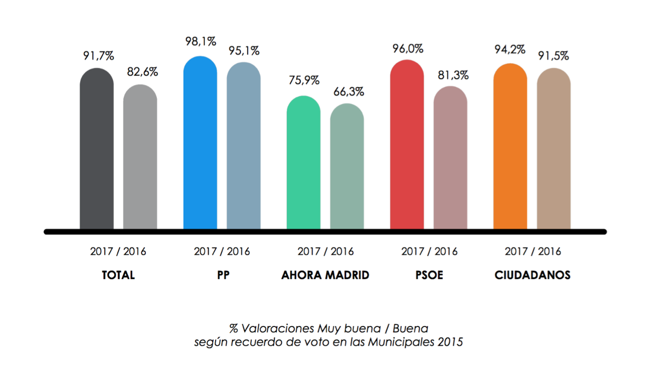 El creciente apoyo al proyecto es unánime entre los votantes de todos los partidos políticos. En el caso de los vecinos que apoyaron la candidatura de Manuela Carmena a la alcaldía, la valoración positiva ha subido del 66,3 al 75,9 por ciento durante el último año. Más importante aún ha sido la mejora de opinión entre los votantes del PSOE, con una subida del 81,3 al 96 por ciento. Pero los niveles más altos de apoyo a la Operación Chamartín se dan entre quienes depositaron la papeleta de PP (98,1 por ciento) o Ciudadanos (94,2 por ciento).
