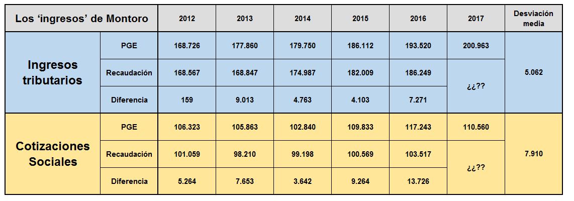 De hecho, el año pasado se merece un análisis aparte. Porque, como apuntábamos, fue un ejercicio excelente, tanto para el empleo como para el crecimiento. Incluso hubo algo de inflación. No mucho, un 1,6% en el conjunto del año, pero sí lo suficiente como para incrementar algo los ingresos nominales, que son los que miden los PGE. Las subidas de precios y salarios siempre son una pequeña ayuda para Hacienda. Pues bien, ni con todos estos elementos favorables de su lado Montoro se acercó a las cifras previstas de recaudación. Ya en su momento, cuando presentó las cuentas en el otoño de 2015, unas semanas antes de las elecciones, hubo muchos analistas que apuntaron a que el cumplimiento de los objetivos de recaudación era poco realista. La cifra final deja cortas aquellas críticas. En lo que respecta a la Seguridad Social, el PGE de 2016 anticipaba unos ingresos de más de 117.000 millones y se han quedado en 133.500. ¿Hay alguna forma de explicar esta diferencia? Este martes, Libre Mercado le preguntaba al ministro por este tema en la rueda de prensa posterior a la presentación de los PGE en el Congreso. No hubo respuesta por su parte.