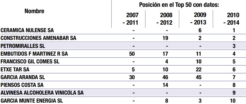 La primera posición del ranking lo ocupa la compañía especialista en la fabricación y comercialización de productos cerámicos Cerámica Nulense con sede en Castellón. Le sigue Construcciones Amenabar, una compañía de construcción de edificios con sede Zarauz. Completa el podio la distribuidora minorista de combustible Petromiralles con sede en Barcelona. Para ver la clasificación completa, pueden acceder al informe en este enlace: