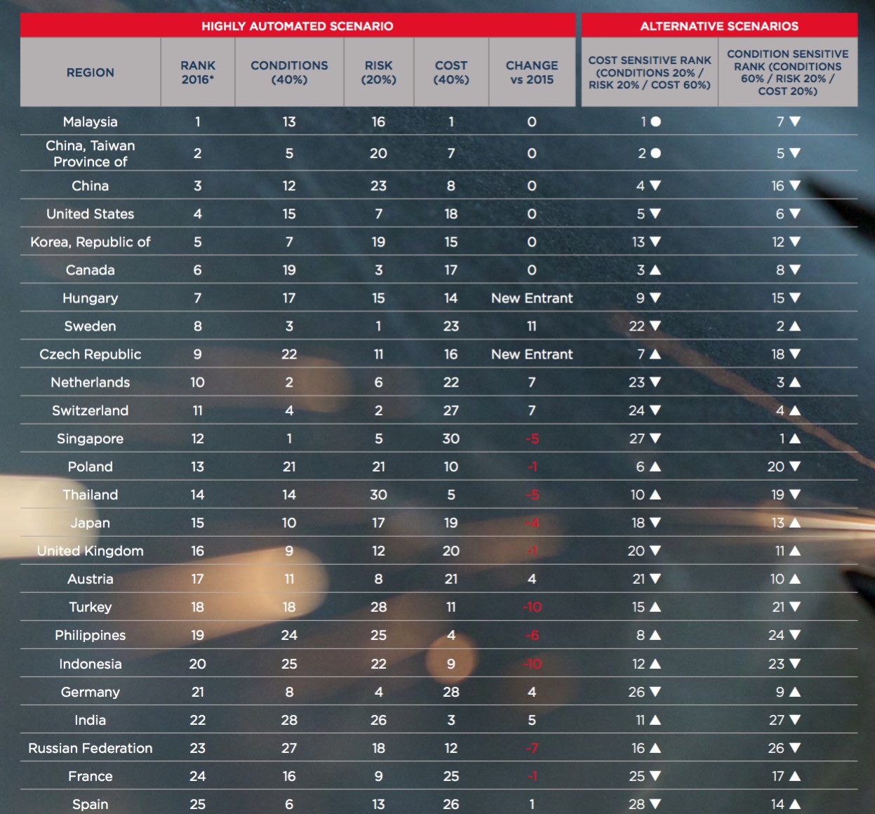 Según el trabajo de Cushman & Wakefield, el país que sale mejor parado es Malasia, seguido de Taiwán y China. Estados Unidos y Corea del Sur completan el top cinco, mientras que Canadá, Hungría, Suecia, República Checa y Países Bajos cierran el top diez. Entre los veinte primeros puestos también están Suiza, Singapur, Polonia, Tailandia, Japón, Reino Unido, Austria, Turquía, Filipinas e Indonesia.