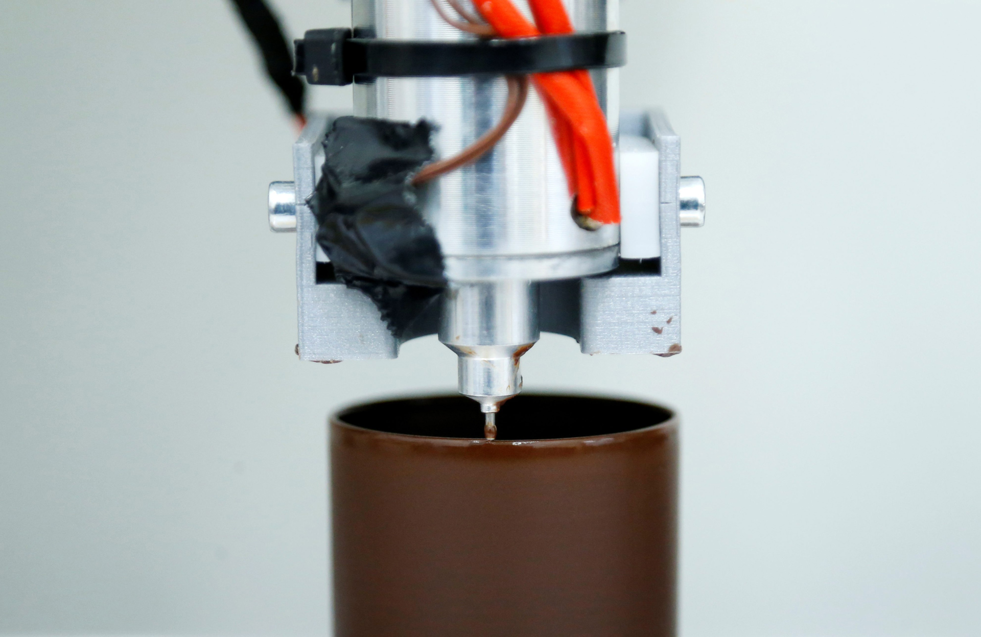 Detalle de la impresora 3D en un momento del proceso de impresión del chocolate.