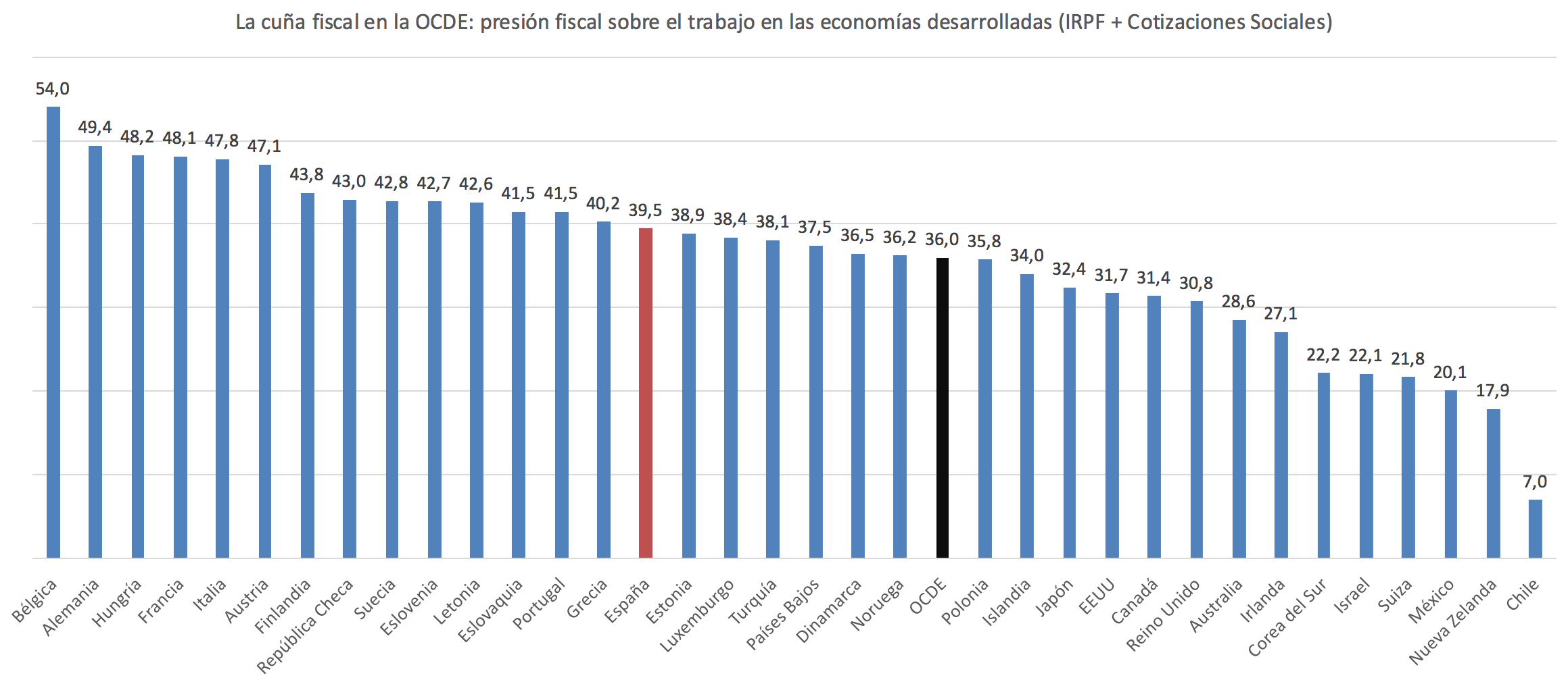 La cuña fiscal media en la OCDE es del 36 por ciento. Por encima de ese umbral se encuentra España, donde la suma de IRPF y cotizaciones sociales reduce nuestro sueldo neto un 39,5 por ciento. Esto significa que un español medio entrega casi 40 euros al fisco por cada 100 euros de coste laboral que paga por él su empleador.