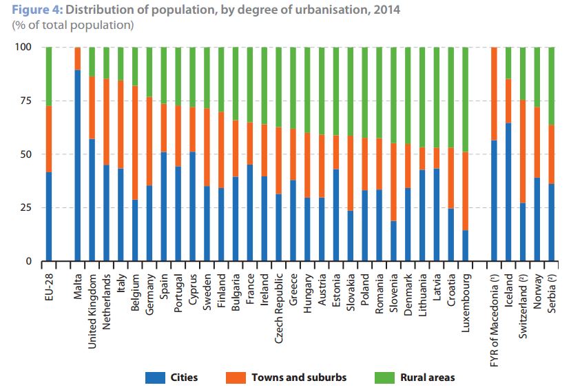 La segunda explicación podría estar en el porcentaje de población urbana. A más gente viviendo en las ciudades, más pisos y menos unifamiliares. En el siguiente gráfico, también de Eurostat, se divide a la población en tres bloques en función de su lugar de residencia: ciudad, pueblo y área rural. Y es cierto que España está en la parte medio-alta de la lista en cuanto a más porcentaje de sus habitantes que viven en ciudades y suburbios (azul y naranja en el gráfico) frente a las áreas rurales (en verde). Pero ni somos los primeros en esto ni un porcentaje elevado de la población urbana parece explicar demasiado: Reino Unido y Holanda, dos de los países con más habitantes urbanos sobre el total también están entre los que tienen más viviendas unifamiliares.