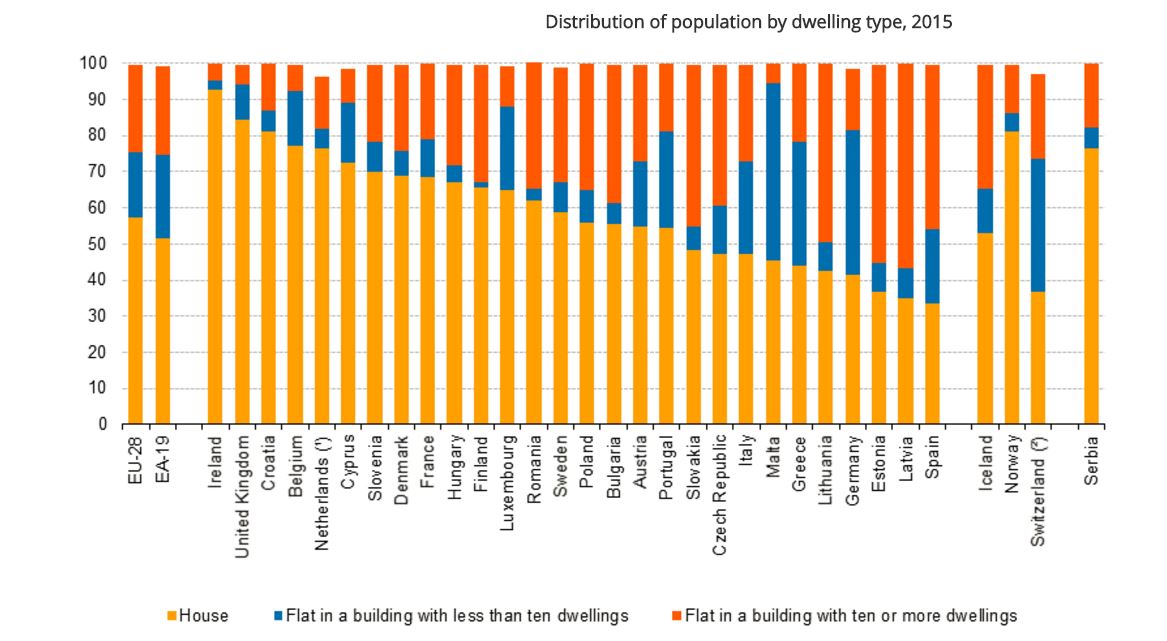 ¿Por qué en España esto no es así? Hace unos días Eurostat publicaba una de esas estadísticas que parecen anecdóticas pero que dicen mucho más de la economía y la sociedad de un país de lo que aparentan a primera vista. Como puede verse en el siguiente gráfico, España es el país de la UE en el que más porcentaje de la población vive en un piso y en el que menos vive en una vivienda unifamiliar. ¿Por qué? No hay una explicación sencilla, pero así es: