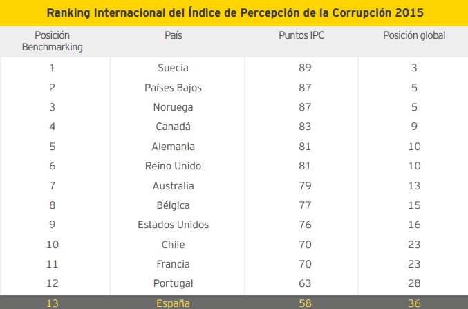 El Índice de Percepción de la Corrupción (IPC) que elabora Transparencia Internacional clasifica al gobierno y al sector público de 168 países teniendo en cuenta aspectos como la transparencia en la información pública, el gobierno abierto, la rendición de cuentas o los niveles de integridad en la prestación de servicios públicos. En el año 2015, España ocupó la posición 36 de la escala mundial, muy por detrás de la mayoría de los países europeos: