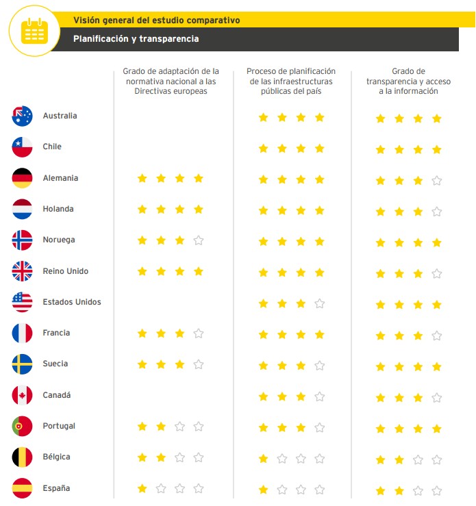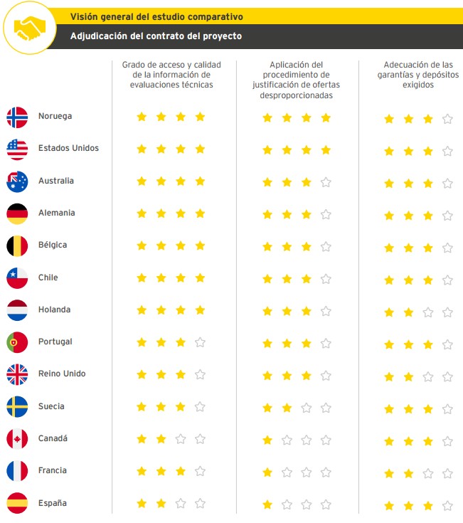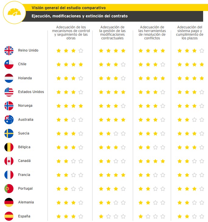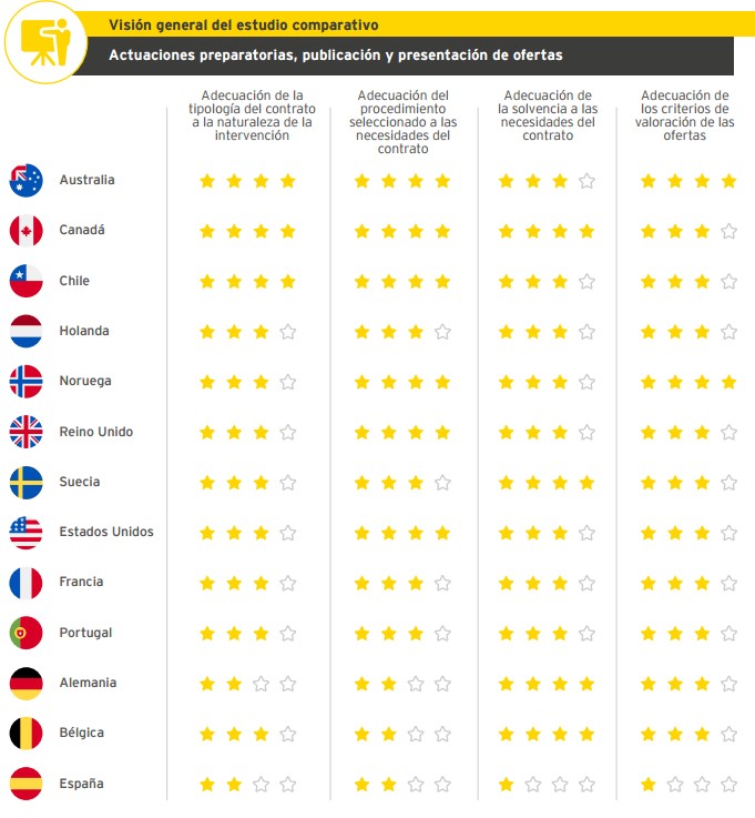 En base a estos y otros defectos, el estudio de EY divide el proceso de contratación en cuatro grandes fases (Planificación, Actuaciones preparatorias, Adjudicación y el capítulo relativo a la Ejecución, modificación y extinción del contrato), con sus correspondientes parámetros, y evalúa su calidad y valoración en distintos países (Alemania, Bélgica, Francia, Holanda, Noruega, Portugal, Reino Unido y Suecia; Australia, Canadá, Chile y Estados Unidos). El resultado no puede ser más desalentador, ya que "la posición de España es, en todos los casos, muy inferior a la del resto de jurisdicciones estudiadas, situándose de manera sistemática en el último lugar"