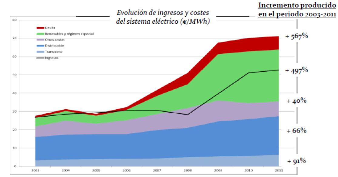 El resultado puede verse en el siguiente gráfico que muestra la evolución de los costes del sistema eléctrico desde el año 2003. Lo que ha disparado el precio de la electricidad en España han sido las primas al régimen general. Y no hablamos sólo de pasado, sino también de lo que supondrán a futuro.