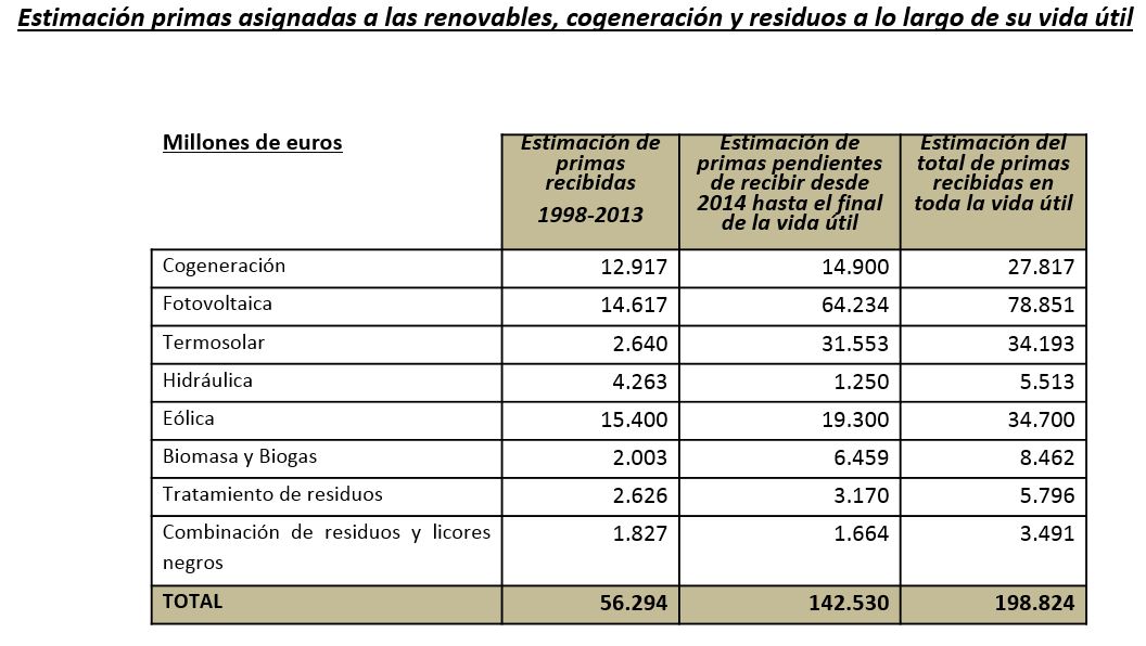 Los cálculos de Estevan Bolea sobre el coste de las renovables, siguiendo datos oficiales del Ministerio de Energía apuntan a que, sumando los 7.000 millones que se prevé que costará este mismo año 2017, las primas al régimen general han ascendido a unos 84.000 millones de euros. Si a esa cifra le sumamos lo que habrá que ir abonando a los productores (si no hay cambios en el marco legal que, por otro lado, podrían ser impugnados en los tribunales), llegamos a casi 199.000 millones de euros. Y aunque mal de muchos... ya se sabe que no es gran consuelo, hay que decir que no somos los que peor estamos. En Alemania, la política de subvenciones a las renovables ya ha costado 150.000 millones y se estima que en los 25 años que hay previsto que se sigan pagando estas primas alcanzará los 520.000 millones. (Ver la siguiente tabla con el desglose de las ayudas en España por tipo de energía):