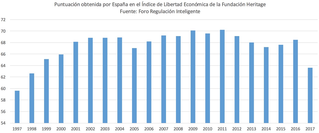 El Índice de Libertad Económica de la Fundación Heritage, presentado en España por Foro Regulación Inteligente y Fundación FAES, ha puesto de manifiesto el deterioro del clima económico en nuestro país. Con una nota de 63,6 puntos, nos quedamos lejos de los 68,5 obtenidos en la pasada edición del ranking.