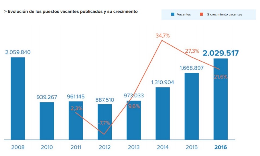 Como vemos, el número de vacantes publicadas en InfoJobs ha vuelto a los niveles de 2008. Se ha producido un incremento importante en los últimos dos años y lo más probable es que buena parte de esta tendencia tenga que ver con la mejoría del mercado laboral.