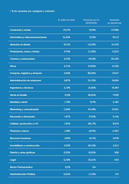 Por categorías, en InfoJobs el ranking de ofertas lo encabezan comercial y ventas (25% del total), Informática (16%) y Atención al cliente (15%). En cuanto al crecimiento 2015-2016, destacan en el lado positivo las ofertas para "compras, logística, almacén" con un 85% más que hace un año (¿el efecto Amazon y en general el boom del comercio online?) y la caída del 8,7% en el sector de la banca (¿por el cierre de sucursales?).