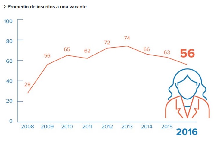Quizás el más significativo de los gráficos sea el que muestra el número de inscritos por vacante. Porque aquí sí se intuye un cambio de tendencia significativo desde 2013: de 74 inscritos por cada puesto en aquel año a 56 en éste. Aquí probablemente haya dos factores para explicar lo que está ocurriendo: por un lado los solicitantes encuentran antes un empleo, con lo que se apuntan a menos ofertas, y por otro, viendo que hay más opciones, son más selectivos en su búsqueda y ya no tiran a todo lo que se mueve.