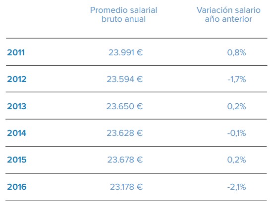 En este contexto, llaman la atención las cifras del cuadro que vemos arriba, en el que se muestran los salarios ofertados de media en Infojobs, que pasan de 23.991 euros en 2011 a apenas 23.178 euros el pasado año (algo por encima de la media del mercado). Así, los salarios medios de las ofertas de InfoJobs están estancados (o incluso apuntan a la baja). Aquí se necesitarían más datos para saber si el problema es de descenso de los sueldos en general o del tipo de oferta que se hace en la web. Es decir, si ahora las vacantes ofertadas son de menor cualificación que hace unos años (quizás porque los puestos de superior nivel se ofertan por otras vías al margen de estas webs) o si hay un descenso en el conjunto de los salarios. Los autores del informe no tienen el desglose necesario para dar una respuesta concluyente, aunque sí apuntan a los "salarios de ingreso" como culpables de esta tendencia: los sueldos que se ofrecen a los trabajadores que llegan al mercado (ya sea desde el paro o desde los estudios) son menores que los que se ofrecen a los que ya tienen un empleo y los primeros cada vez tienen más presencia en las ofertas.