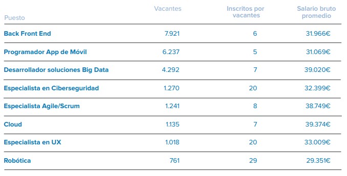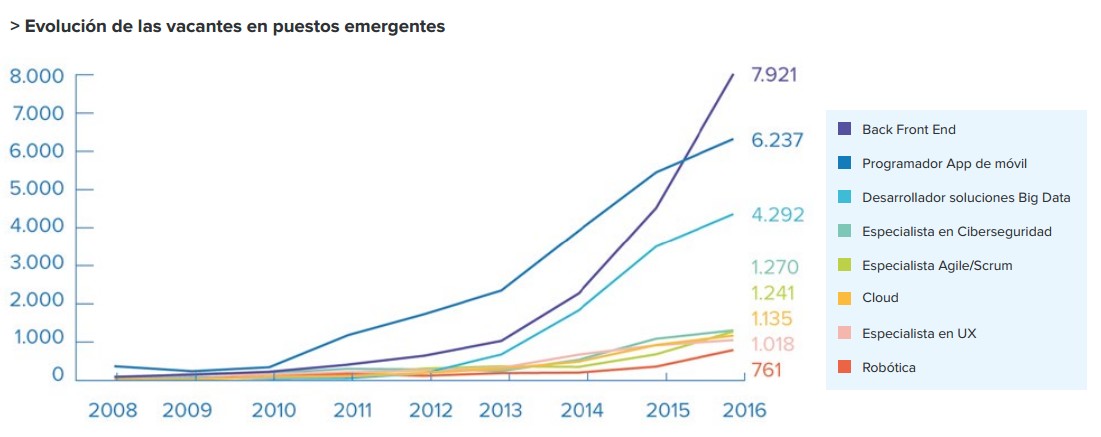 Por último, los puestos de trabajos "emergentes". Como explicábamos al comienzo del artículo, estos son los puestos nuevos (para los que no existían ofertas en InfoJobs hace 8-9 años) pero que ahora acumulan ofertas por miles. Lo relevante no es sólo el crecimiento experimentado, sino los sueldos que ofrecen (muy por encima de la media en todos los casos) y el número de candidatos por oferta (muy por debajo de lo habitual en otros sectores). Si esto puede servir como indicador, son una buena pista de por dónde hay ahora oportunidades en el mercado laboral español: Back Front End, Programador App de Móvil, Desarrollador Soluciones Big Data, Especialista en Cíberseguridad, Especialista Agile / Scrum, Cloud, Especialista en UX, Robótica.