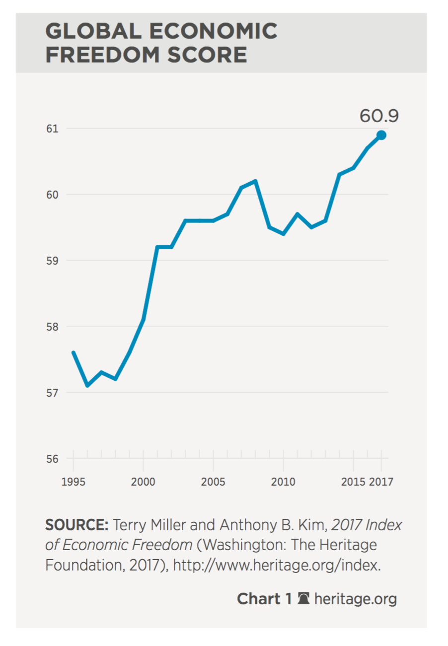 El documento también refleja que, conforme la libertad económica ha ido creciendo, el PIB mundial ha aumentado y la tasa global de pobreza se ha reducido.