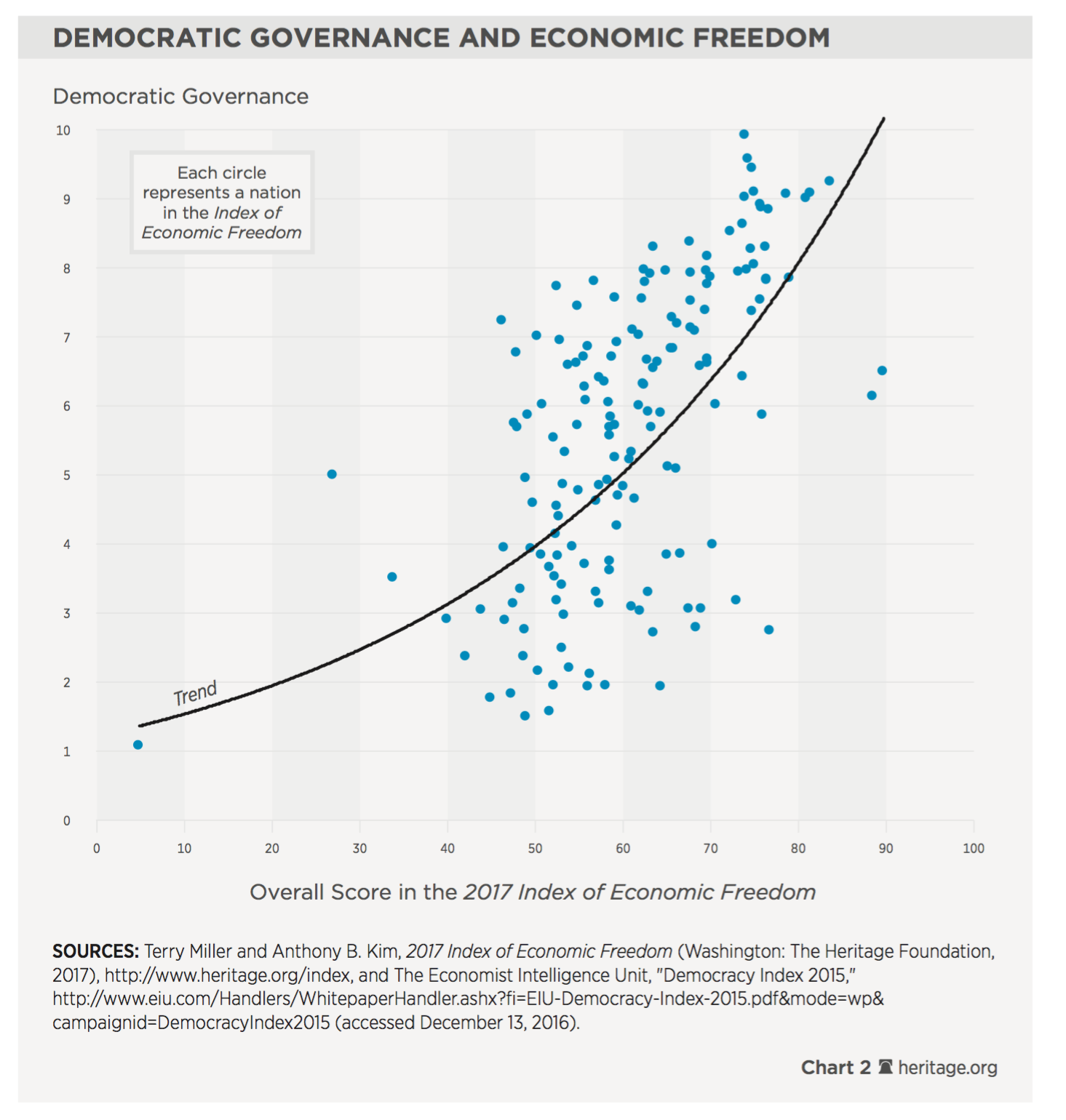 Existe, además, una notable correlación entre la calidad de las instituciones democráticas y la libertad económica. Así lo refleja esta gráfica, que cruza datos del Índice con los estudios sobre instituciones políticas que elabora The Economist.