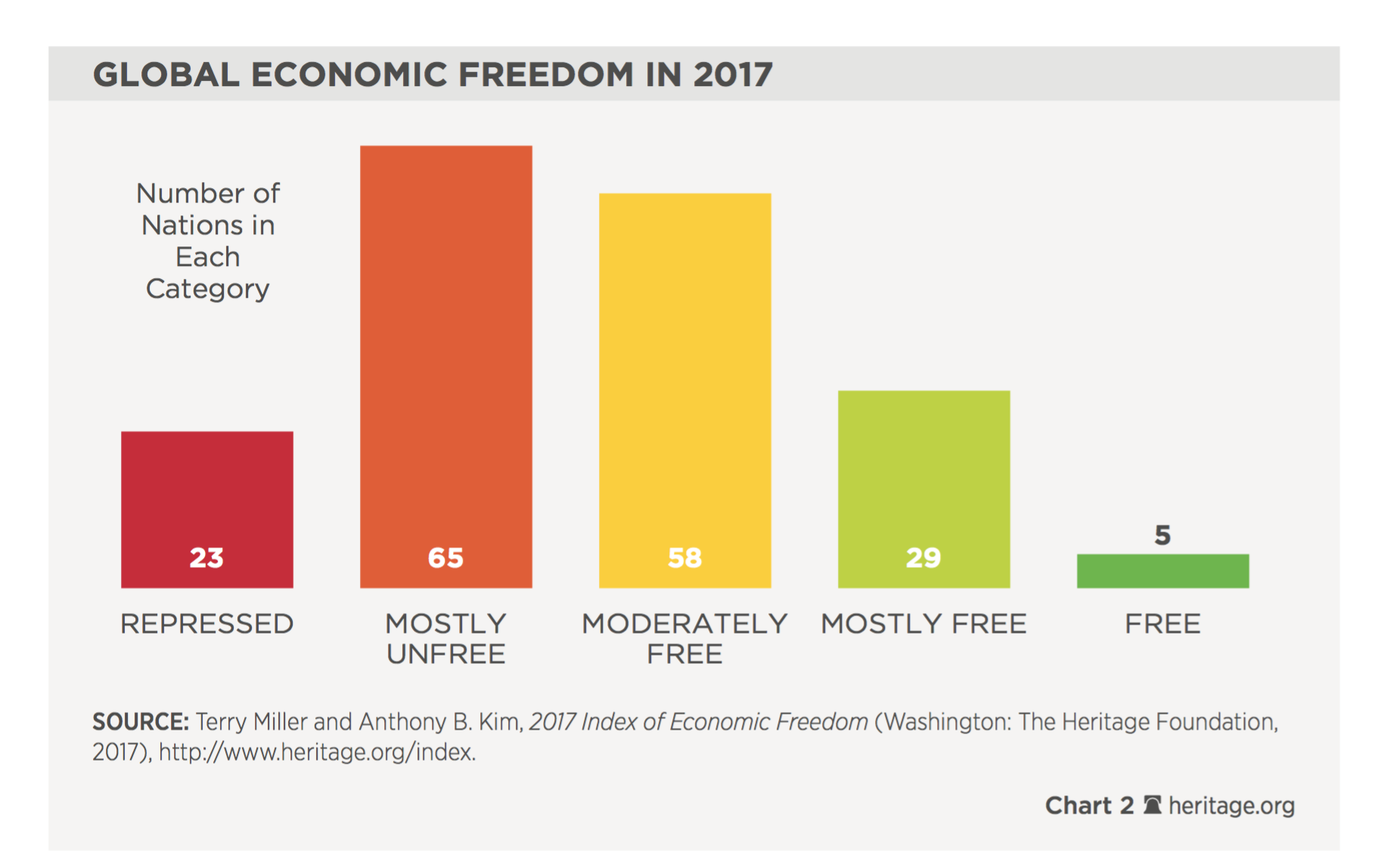 ¿Cómo se reparte el liberalismo económico en el mundo? Hay 23 economías completamente cerradas, 65 bastante cerradas, 58 en una situación intermedia, 29 relativamente libres y 5 muy abiertas.