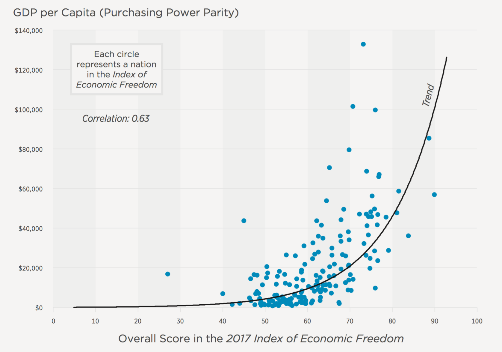 El PIB per cápita, medido en paridad de poder adquisitivo, también tiende a crecer conforme aumenta el grado de libertad económica de las distintas economías del mundo.