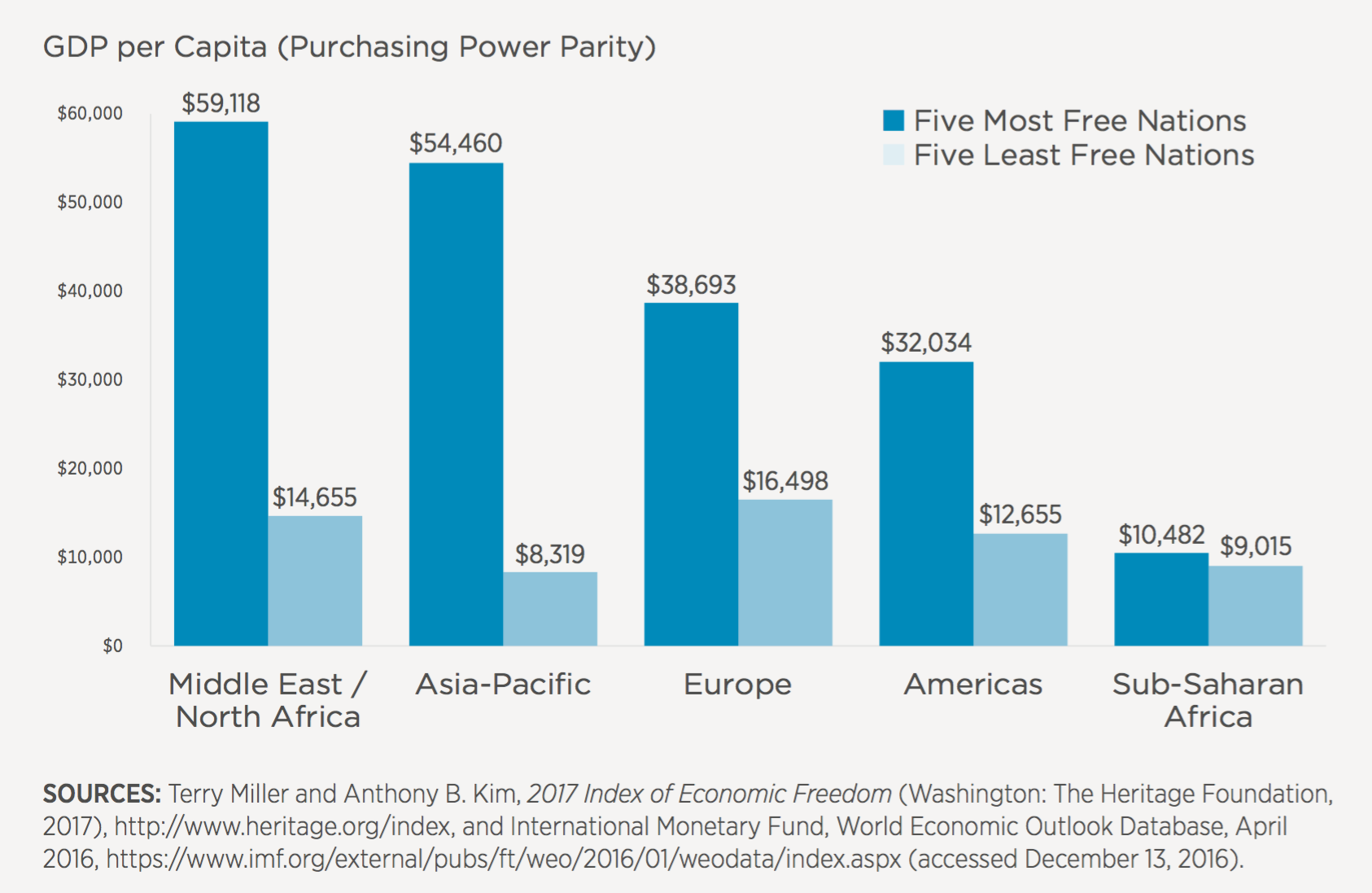 Si planteamos la comparativa por regiones, nos encontramos igualmente con fuertes diferencias en el PIB per cápita de los países más liberales y el de los menos abiertos al capitalismo.