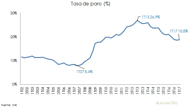 El primero y más importante, encabezando la lista de preocupaciones de la población, es el paro. La tasa de desempleo se situó en el 18,8% en el primer trimestre del año, lo que supone 8 puntos menos que el máximo registrado a inicios de 2013, cuando alcanzó el 26,9%, pero todavía 10 puntos por encima del mínimo de hace diez (8,4% en el primer trimestre de 2017).
